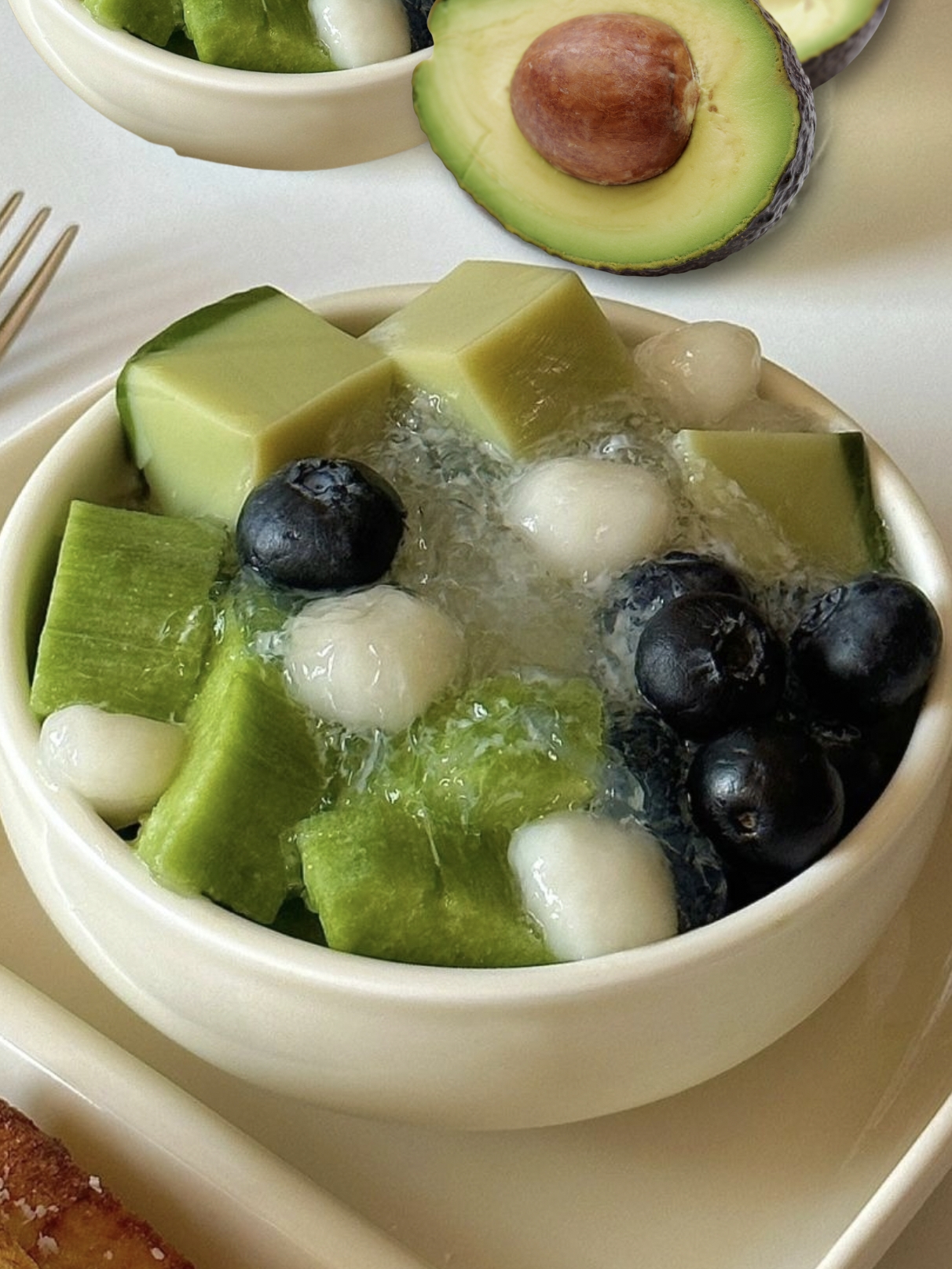 Thêm bánh trôi, bơ, blueberry lên trên.