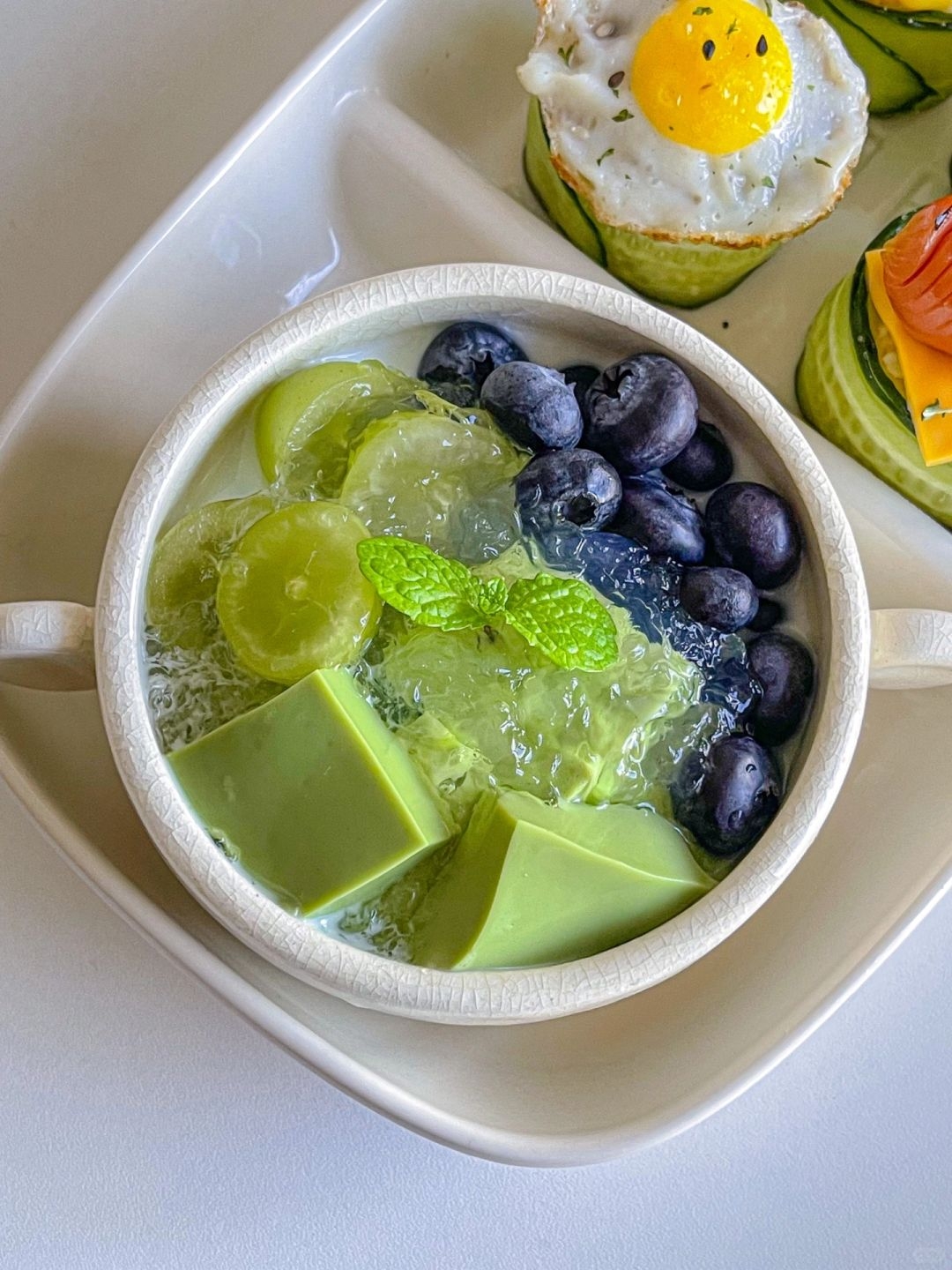 Thêm yến chưng, thạch matcha, và trái cây tươi (nho xanh, việt quất).