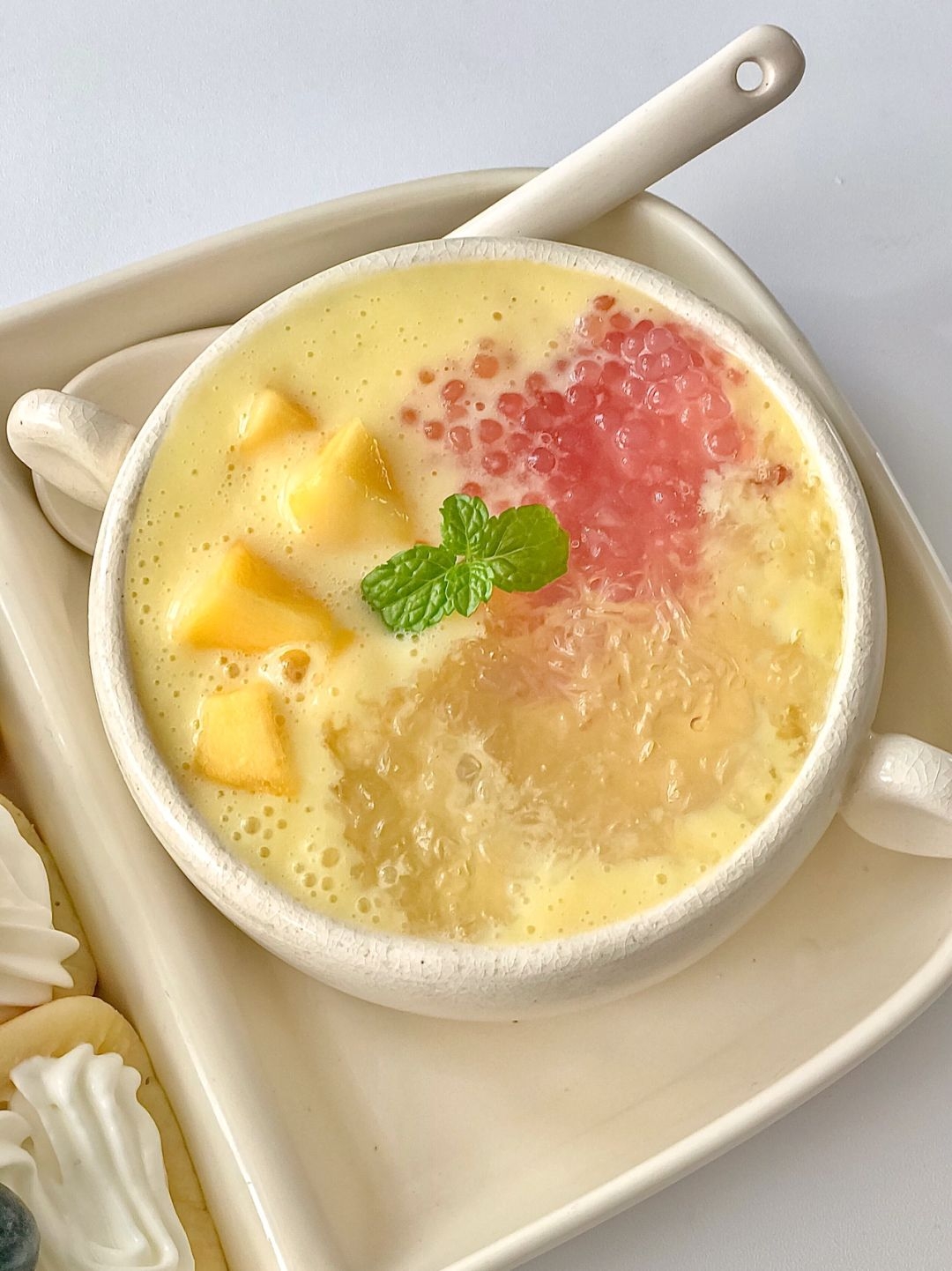 Món yến chưng xoài cốt dừa trân châu không chỉ đẹp mắt mà còn bổ dưỡng, mát lạnh, thích hợp làm món tráng miệng hoặc bữa phụ bổ sung năng lượng. Hãy thử ngay để cảm nhận sự hòa quyện của vị béo, ngọt, thanh mát trong từng muỗng nhé!